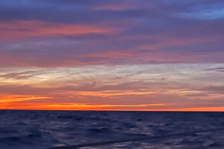 In Gedanken versunken sitze ich hinten am Heck, halte alle paar Minuten einen ‚Rundumblick‘. Es zischt neben mir, ich erschrecke mich und springe auf, mein Herz rast. Was ist passiert? Ein Delfin im Wasser, direkt neben mir. Diese andächtigen Tiere, die ich am Tag immer wieder über die Weite des Meeres gesucht habe, deren Anblick mich so euphorisch gemacht, wenn ich sie um das Boot herumschwimmen und spielen sah, die fast schon kitschig in den Sonnenuntergang schwammen, … jetzt machen sie mir fast ein bisschen Angst. Und dahinten – was ist das denn? Plötzlich am Horizont, ein roter Feuerball, der schnell auf mich zukommt. Brennt da was? Auf dem Wasser?? Es wird immer größer!  Soll ich meinen Mann wecken? Rechtzeitig erkenne ich noch, dass es der Mond ist, der mitten in der Nacht aufgeht. Ich kann mich nicht erinnern, dass ich das schon einmal gesehen habe.